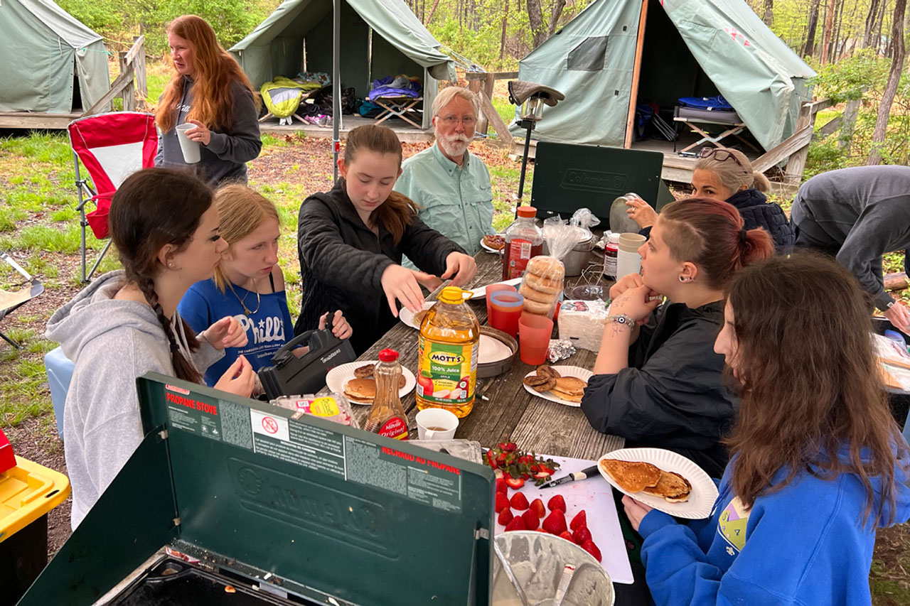 One piece of good news was that the camp already had the tents set up for summer camp, so the Scouts didn't have to set up in the rain. Here are the Thunderbreads and breakfast on Saturday morning.