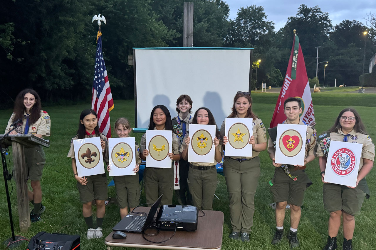 Our SPL (extreme left) introduced seven Scouts who explained the requirements for each of the seven ranks at an outdoor Eagle Court of Honor for our new Eagle Scout (rear) at in July 2025.