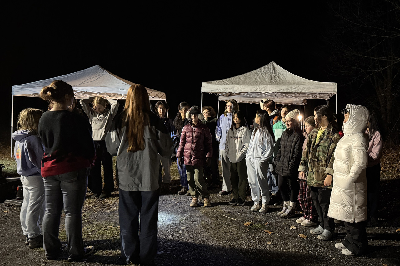 The Assistant Senior Patrol Leaders are reviewing the troop rules for camping after safe arrival at Resica Falls for our November trip. Patrol cooking areas have been set up outdoors, but we're staying in cabins.