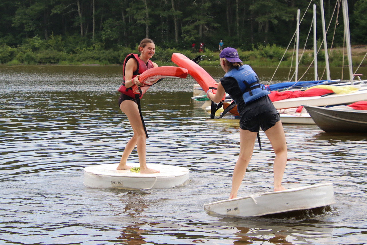 These Scouts are jousting with the goal of knocking eachother into the water.